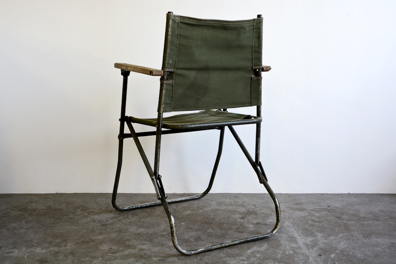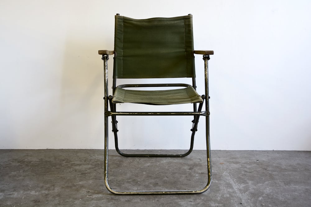 イギリス軍の ROVER ARMY CHAIR 。ミリタリー物のヴィンテージ。イギリス軍用トラック Land Rover Wolf の後部座席として使われていた折りたたみ椅子。ビンテージ品の為、傷や汚れはあります。